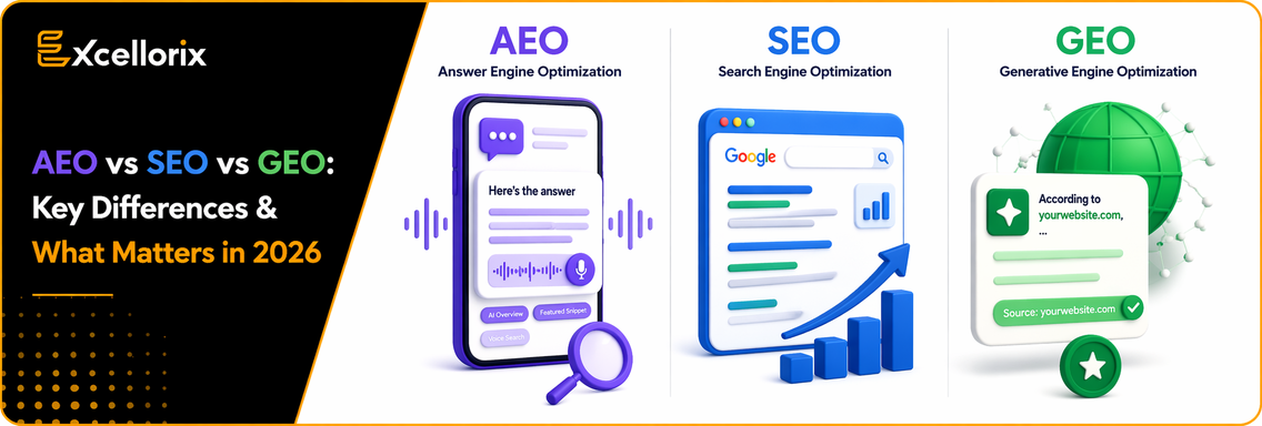 SEO focuses on improving visibility on search engines like Google to drive organic traffic. AEO focuses on getting your content selected as a direct answer in snippets voice search and AI generated summaries. GEO focuses on making your brand appear and get cited inside AI generated responses from tools like ChatGPT and Perplexity.