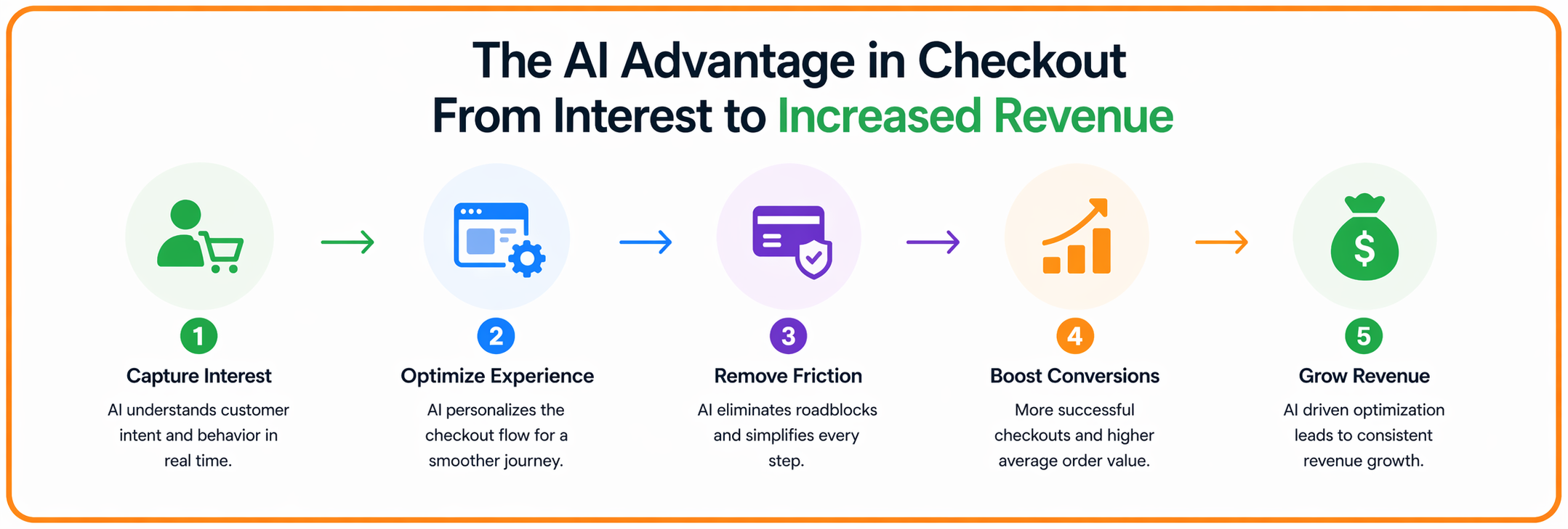 AI improves revenue by making checkout faster, more personalized, and easier to complete. It reduces friction, introduces relevant upsells, and helps customers move through the process smoothly, leading to higher conversions and increased order value.